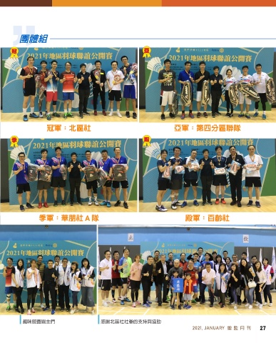 團體組 冠 亞 許清恭+吳彥昌 (華岡九合聯隊) 冠軍:北區社 亞軍:第四分區聯隊 季 殿 林鎂惠+馮慧敏(華山社) 季軍:華朋社 A 隊 殿軍:百齡社 張淑媛+彭士恩(百齡扶青社) 許清恭+黃玫真 趣味競賽關主們 感謝北區社社眷的支持與協助 (華岡九合聯隊) 2021, JANUARY 27
