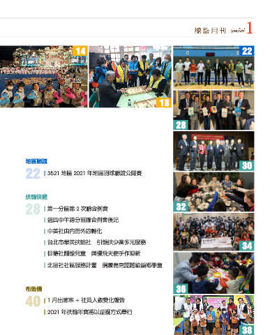 JANUARY1 1 14 22 18 28 地區聯誼 30 22 3521 地區 2021 年地區羽球聯誼公開賽 扶輪快遞 28 第一分區第 2 次聯合例會 32 週四中午跨分區聯合例會後記 中美社由內而外的轉化 台北市華英扶輪社 引領扶少團多元服務 34 仰德社關懷兒童 與慢飛天使手作迎新 北區社社區服務計畫 捐贈烏克麗麗給偏鄉學童 布告欄 36 40 1 月出席率 + 社員人數變化報告 2021 年扶輪年會將以虛擬方式舉行 38